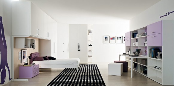 Gam màu-đen trắng không bao giờ bị lỗi mốt. Tuy nhiên vì là phòng dành cho trẻ em nên sắc tím làm điểm nhấn khiến căn phòng không trở nên nhàm chán